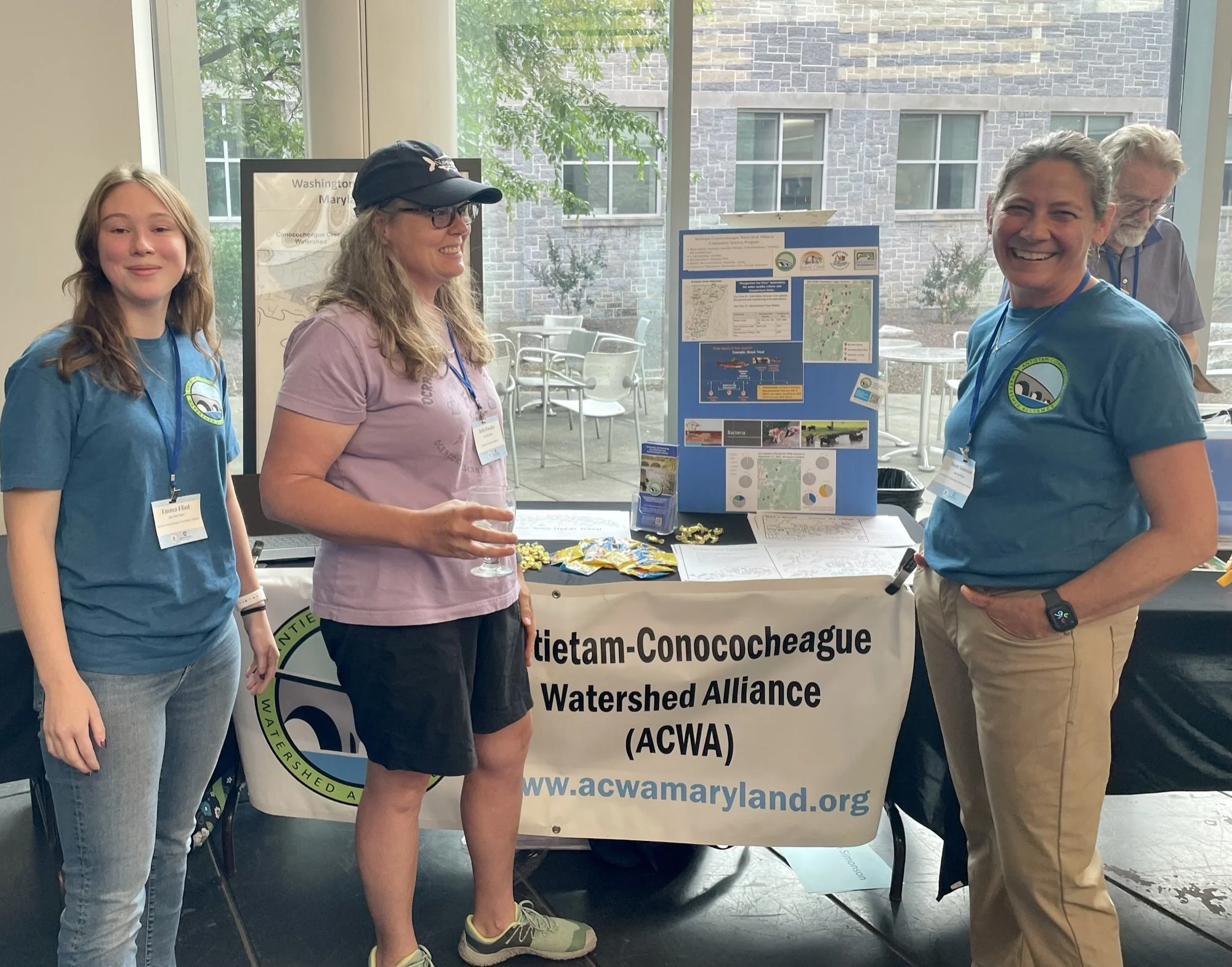Emma (left) working the ACWA table at the Mid-Atlantic Volunteer Water Quality Monitoring Conference, June 2023